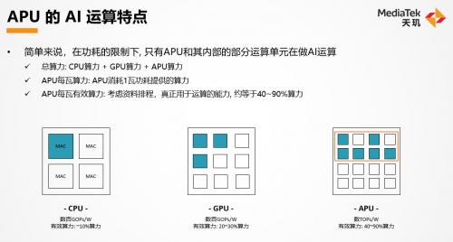 毋庸置疑,很显然是第一种搭载独立APU处理器的芯片能更好的发挥性能和能效。从下图可以看到,CPU的有效算力小于10%,GPU大概在20%-30%,而使用独立的APU则可以高达40%-90%。因此,做AI模型运算的效率从高到低依次为APU > GPU > CPU,权衡手机功耗因素,必然应优先使用APU。