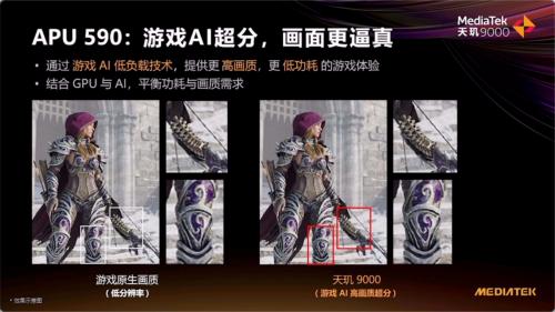 天玑9000依托于APU590的超强实力,带来了游戏AI超分技术,以GPU+APU协同工作,平衡功耗与画质需求。通过游戏AI低负载技术,GPU只需更低的渲染资源消耗,就能获得接近原生高分辨率的画质,起到提升游戏画质同时降低功耗的作用。