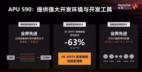 AI技术的发展始终离不开强大的开发环境和开发工具的支持,APU590支持神经网络架构搜索技术、视频带宽降低技术以及网络混合精度技术,赋能开发者高效多元化的AI应用。从另一个视角来看,联发科围绕APU构建了丰富的AI生态,在应用和框架层面与OPPO、vivo、小米以及抖音、虹软、安卓等合作伙伴开展紧密合作。