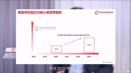 知名市场调研机构Counterpoint在白皮书中指出:2023年由SoC驱动的具有专用AI核心的智能手机的比例预计将超过75%,而2020年时这个数字仅约为35%。换言之,未来1-2年,独立的AI核心不仅会运用在旗舰机、高端机上,还会在主流机、入门机中得到大量普及。