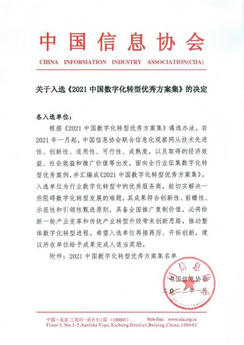 为深入实施“十四五”创新驱动发展战略,推动优秀创新成果和前沿科技落地转化,中国信息协会将联合信息化观察网从技术先进性、创新性、适用性、可行性、成熟度,以及取得的经济效益、社会效益和推广价值等出发,遴选符合行业发展方向的突出建设成就与优秀服务案例,并汇编成《2021中国数字化转型优秀方案集》(简称“方案集”)。通过整合集聚优势创新资源,归纳出面向未来、立足成长的数字化转型模型,以期提升产业创新能力和企业核心竞争力,促进先进技术产品规模化推广应用,为数字经济发展增添新活力、注入新动能。