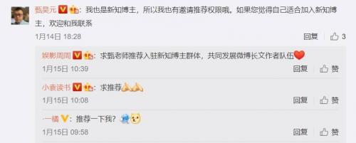 已经认证微博新知博主的“元老们”也纷纷向站内外优秀创作者抛出橄榄枝,“我也是新知博主,所以我也有邀请推荐权限哦。如果您觉得自己适合加入新知博主,欢迎和我联系。”