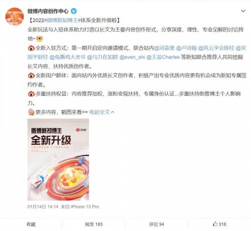 2022年1月14日,微博发布“微博新知博主体系升级计划”,聚合“流量扶持、内容补贴、产品权益”三重激励政策,面向站内站外优质博主,持续推动以长文为主要内容创作形式,共创微博深度、理性讨论氛围。