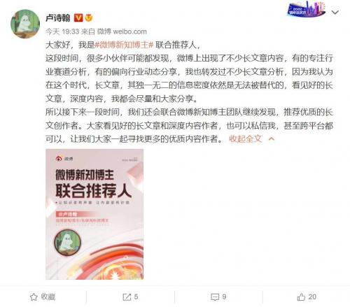 作为本次计划的联合推荐人,互联网科技博主@卢诗翰表示,“很多小伙伴可能都发现,微博上出现了不少长文章内容,有的专注行业赛道分析,有的偏向行业动态分享。我认为在这个时代,长文章,其独一无二的信息密度依然是无法被替代的,看见好的长文章,深度内容,我都会尽量和大家分享。所以接下来一段时间,我们还会联合微博新知博主团队继续发现,推荐优质的长文创作者。让我们大家一起寻找更多的优质内容作者。”