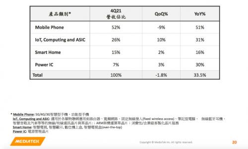 收益于多元化产品布局、5G与WiFi6技术持续升级、拓展新应用及高阶市场等多重因素,可以预计联发科将在2022年稳固地持续成长。不仅在手机产品有亮眼表现,联发科已发展至多元的产品布局,并具备稳固的基础与韧性面对潜在市场波动,手机、智能终端与电源管理三大版块皆有各自的成长动能,并将享有均衡且健康的成长。