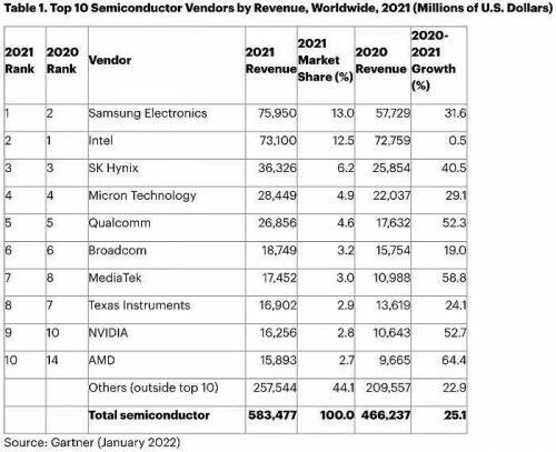 来自美国研究机构Gartner的数据显示,2021年全球营收前十的半导体提供商,联发科位列第七,相比于2020年增长率达到58.8%,涨幅排名第二,也印证了2021年联发科的多元化布局得到了市场良好的反馈。