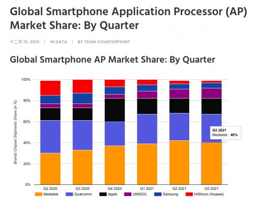 得益于5G市场的火热以及产品出色的性能、功耗表现,联发科推出的天玑5G芯片受到了市场上主要手机厂商的青睐以及用户的认可。根据调研机构Counterpoint的2021年第三季度报告,联发科的手机芯片份额全球占比高达40%,连续五个季度位居榜首。