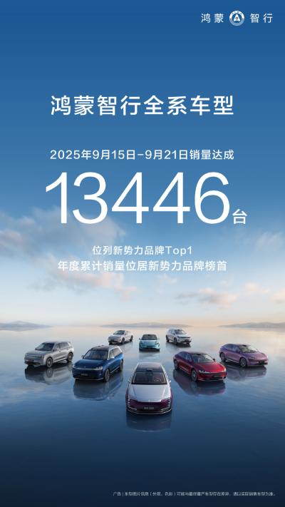 鸿蒙智行官方今日公布了2025年第38周(2025年9月15日- 9月21日)销量为13446台,位列新势力品牌Top1,同时年度累计销量位居新势力品牌榜首。