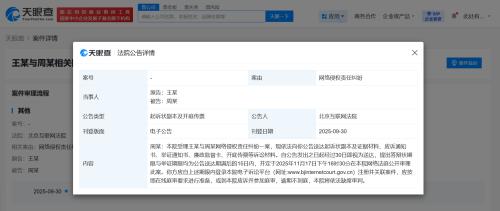 天眼查App显示,近日,北京互联网法院向周某公告送达原告王一博与其网络侵权责任纠纷一案起诉状副本及证据材料、应诉通知书、开庭传票等诉讼材料。自公告发出之日起经过30日即视为送达,并定于11月17日公开审理此案。