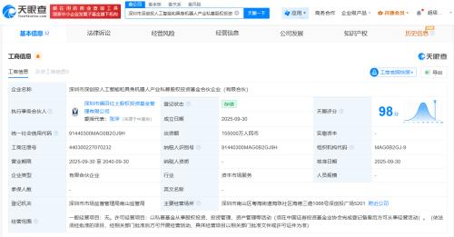 天眼查App显示,近日,深圳市深创投人工智能和具身机器人产业私募股权投资基金合伙企业(有限合伙)成立,执行事务合伙人为深圳市福田红土股权投资基金管理有限公司,出资额15.5亿人民币,经营范围包括以私募基金从事股权投资、投资管理、资产管理等活动。合伙人信息显示,该基金由深圳市引导基金投资有限公司、深圳市福田红土股权投资基金管理有限公司、深圳市红土创业投资有限公司、深圳市汇通金控基金投资有限公司共同出资。