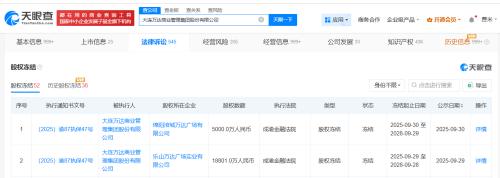 天眼查天眼风险信息显示,近日,大连万达商业管理集团股份有限公司新增两则股权冻结信息,股权所在企业分别为乐山万达广场实业有限公司、绵阳涪城万达广场有限公司,冻结股权数额分别为约1.88亿人民币、5000万人民币,冻结期限均为三年,执行法院均为成渝金融法院。