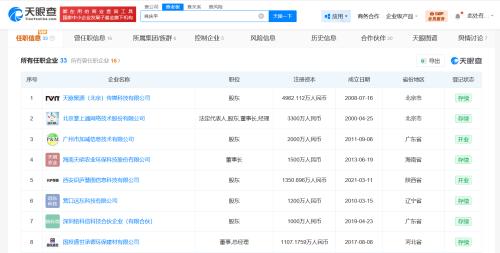 天眼查App显示,肖庆平名下共关联30余家企业,其中21家为存续状态,包括北京掌上通网络技术股份有限公司、广州市加减信息技术有限公司、海南天明农业环保科技股份有限公司、国投盛世承德环保建材有限公司等,肖庆平在上述企业中担任董事长、经理、监事等职务,版图涉及信息科技、金融、传媒等。任职信息显示,肖庆平在7家企业担任法定代表人,并持有19家企业的股份。