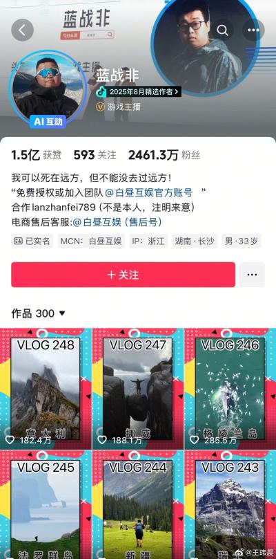 千万粉丝抖音网红“蓝战非”的账号已经恢复,在其账号被封的15天中,一共掉了30多万粉。
