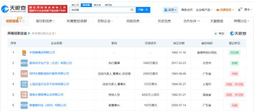 天眼查App显示,向华强名下关联6家企业,其中2家处于存续或者仍注册状态,分别是星传动文化产业(北京)有限公司、中国星集团有限公司,其余4家企业已被吊销,分别是深圳永盛影视制作服务有限公司、上海杰逊文化艺术咨询有限公司、海南永盛音像企业有限公司、智慧星科技(深圳)有限公司。