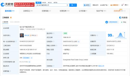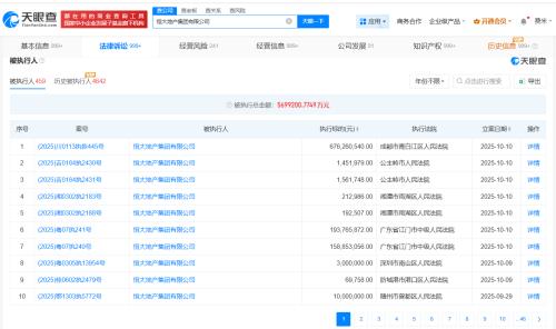 天眼风险信息显示,恒大地产集团有限公司现存450余条被执行人信息,被执行总金额超569亿元,此外,该公司还存在多条限制消费令、失信被执行人(老赖)及终本案件信息。
