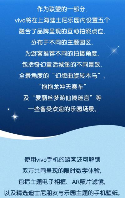 据上海迪士尼度假区官方公众号公布,10月13日,上海迪士尼度假区与全球智能终端和智慧服务提供商vivo共同宣布双方达成战略联盟,vivo成为上海迪士尼度假区的官方合作伙伴。