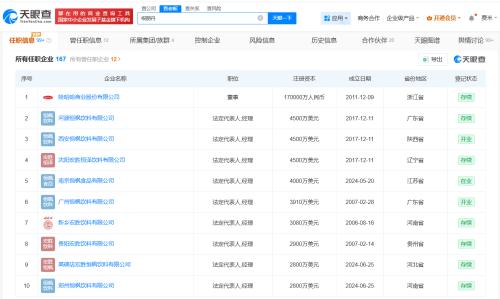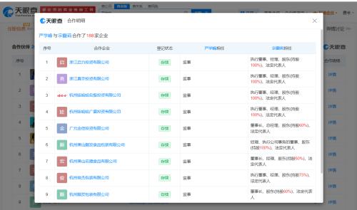 天眼查App显示,严学峰名下关联近190家企业,其中180余家处于存续状态,包括娃哈哈商业股份有限公司、河源恒枫饮料有限公司、浙江迅尔城通货运有限公司等。值得一提的是,严学峰名下关联近百家娃哈哈企业,包括杭州娃哈哈启力食品集团有限公司、杭州娃哈哈乐维食品有限公司等,严学峰在上述公司担任监事。合作伙伴信息显示,严学峰与宗馥莉共同关联188家企业,包括浙江启力投资有限公司、浙江真宗投资有限公司等。