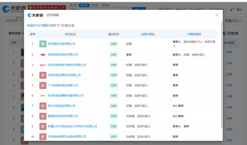 祝丽丹名下关联160余家存续企业,包括娃哈哈商业股份有限公司、河源恒枫饮料有限公司、西安恒枫饮料有限公司等,值得一提的是,祝丽丹名下关联近百家娃哈哈企业,包括杭州娃哈哈乐维食品有限公司、杭州娃哈哈非常可乐饮料有限公司等,祝丽丹在上述公司担任法定代表人、经理。合作伙伴信息显示,祝丽丹与宗馥莉共同关联150余家企业,包括杭州顺发包装有限公司、南宁宏胜食品有限公司等。