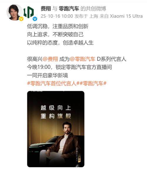 零跑汽车今日正式官宣,费翔成为零跑汽车D系列代言人,同时也是零跑汽车首位代言人。