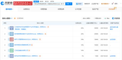 天眼查工商信息显示,近日,南京金雨茂物战新软信人工智能创业投资合伙企业(有限合伙)成立,执行事务合伙人为南京金希投资管理合伙企业(有限合伙),出资额10亿人民币,经营范围为创业投资。合伙人信息显示,该合伙企业由江苏南京软件和信息服务产业专项母基金(有限合伙)、南京建邺高投壹号产业投资合伙企业(有限合伙)、南京今茂管理咨询合伙企业(有限合伙)等共同出资。