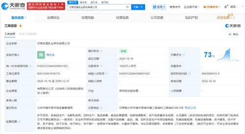 天眼查App显示,近日,甘肃农垦乳业研究有限公司成立,法定代表人为陶生俭,注册资本1000万人民币,经营范围包括乳制品生产、生鲜乳收购、饮料生产、食品销售、食品经营管理等。股东信息显示,该公司由庄园牧场(002910)全资持股。