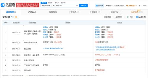 天眼查App显示,近日,华望汽车技术(广州)有限公司发生工商变更,新增广汽埃安新能源汽车股份有限公司为股东,注册资本由15亿人民币增至21亿人民币,增幅40%,同时多位高管发生变更。