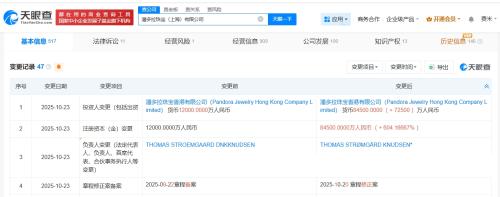 天眼查App显示,近日,潘多拉珠宝(上海)有限公司发生工商变更,注册资本由1.2亿人民币增至8.45亿人民币,增幅约604%。
