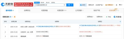 天眼查App显示,近日,中芯国际控股有限公司发生工商变更,注册资本由52.5亿美元增至59.5亿美元,增幅约13%。