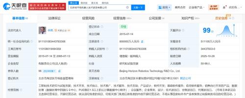 该公司成立于2015年7月,法定代表人为余凯,注册资本80亿人民币,经营范围含工程和技术研究与试验发展、软件开发、基础软件服务、应用软件服务、销售自行开发的产品、数据处理等,由北京地平线信息技术有限公司全资持股。