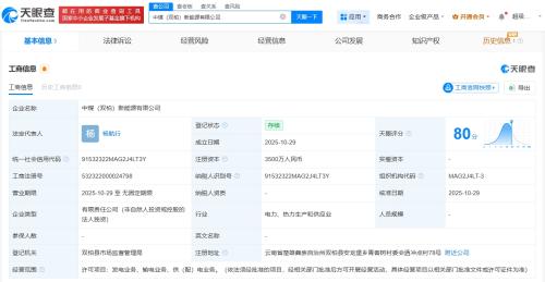 天眼查App显示,近日,中煤(双柏)新能源有限公司成立,法定代表人为杨航行,注册资本3500万人民币,经营范围为发电业务、输电业务、供(配)电业务,由中国中煤旗下中煤绿能科技(北京)有限公司全资持股。