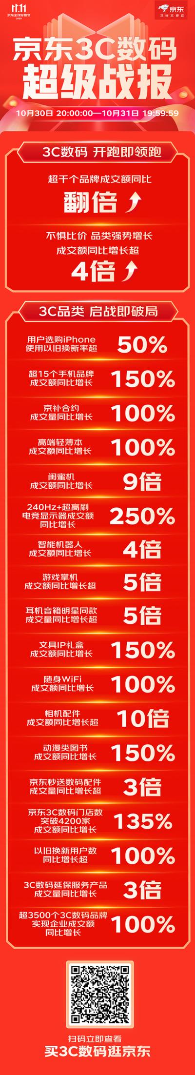 众多消费者到京东11.11换新手机,近24小时,超15个手机品牌成交额同比增长超150%,50%用户使用以旧换新选购iPhone。同时,各类3C数码趋势品类增长显著,智能机器人成交额同比增长4倍,高端轻薄本、随身WiFi同比增长100%,小平板、相机配件同比增长10倍,240Hz+超高刷电竞显示器同比增长250%,闺蜜机同比增长9倍,游戏掌机同比增长超5倍,激光打印机同比增长130%,文具IP礼盒、动漫类图书同比增长150%,京补合约成交量同比增长100%,耳机音箱明星同款成交量同比增长超5倍。