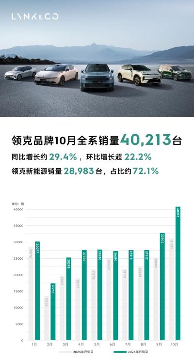 2025年10月,领克品牌全系单月销量实现40,213台,再创历史新高!同比增长29.4%,环比增长22.2%。品牌加权平均价突破20万元,领克以高价值的产品和用户生态,构建向上的品牌竞争力。其中,领克新能源车型销量28,983台,占比72.1%。2025年1-10月,领克累计销量281,685台,同比增长约24.3%。