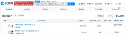 天眼查App显示,近日,内蒙古培育重点产业引导基金股权投资合伙企业(有限合伙)成立,执行事务合伙人为中财融商(北京)资本管理有限公司,出资额86.75亿人民币,经营范围包括以私募基金从事股权投资、投资管理、资产管理等活动。合伙人信息显示,该基金由内蒙古金融资产管理有限公司、中财融商(北京)资本管理有限公司共同出资。