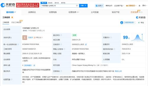 天眼查工商信息显示,近日,中铜西藏矿业有限公司发生工商变更,注册资本由2.5亿人民币增至50亿人民币,增幅1900%。同时,部分主要人员发生变更。