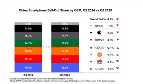 市调机构Counterpoint发布了今年第三季度中国智能手机市场份额榜单,其中vivo继续保持第一。报告中指出,受经济增长放缓及需求降低的影响,2025年第三季度中国智能手机销量同比下降2.7%。从厂商表现来看,2025年第三季度,在市场竞争加剧的影响下,vivo的市场份额降至18.5%,但依然保持第一。