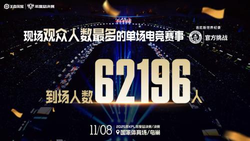 2025KPL年度总决赛打破吉尼斯世界纪录,到场人数62196人,成为现场观众人数最多的单场电竞赛事。