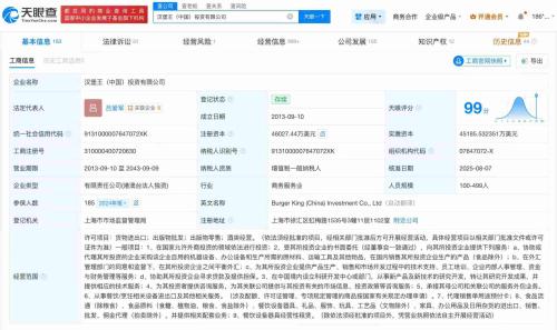 天眼查App显示,汉堡王中国关联公司汉堡王(中国)投资有限公司成立于2013年9月,法定代表人为吕爱军,注册资本约4.6亿美元,经营范围包括货物进出口、出版物批发、出版物零售等。股东信息显示,该公司由BK (Hong Kong) Development Co., Limited全资持股。变更记录显示,今年8月,该公司曾发生董事变更。此外,今年以来,汉堡王(中国)投资有限公司曾两次增资,由约3.1亿美元增至约4.6亿美元。