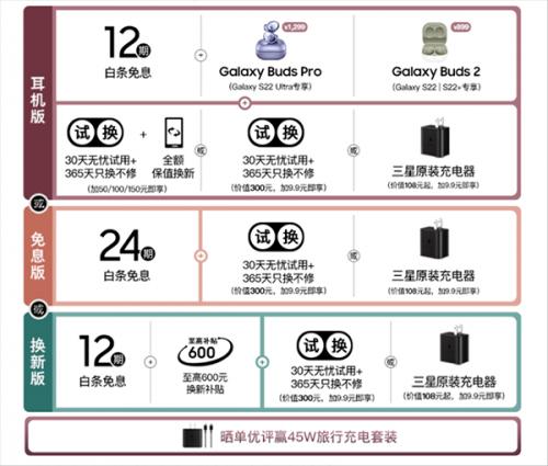 如果你还想最大程度降低换新成本,京东还有7种购机套餐可选,只需支付100元定金即可享包含分期免息、30天无忧试用、365天只换不修、100%保值换新等在内的7种组合权益。其中,30天无忧试用是指,用户在下单30天内,只需保障商品完好、无故障标准即可申请退货;365天只换不修是指,在365天内出现产品质量问题,京东可以直接换新机;而100%保值换新则是指,在用户签收新机的181天至450天内,通过以旧换新购买下一代三星S系列产品时,能100%抵扣新机金额,只需支付两代产品的差价。