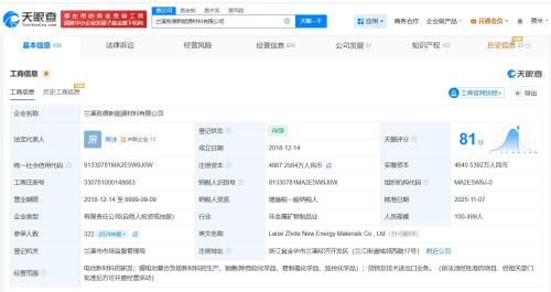 天眼查工商信息显示,近日,兰溪致德新能源材料有限公司发生工商变更,原股东湖南臻泰科创产业投资合伙企业(有限合伙)退出,新增宁德时代参投的福建时代泽远股权投资基金合伙企业(有限合伙)以及深圳市绿水长青创业投资合伙企业(有限合伙)为股东,注册资本由约4853.3万人民币增至约4867.3万人民币。同时,多位主要人员发生变更。