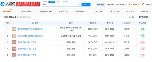 天眼查App显示,乔欣名下共关联5家企业,其中2家为存续状态,分别为重庆欣映界影视文化传媒有限公司、深圳市燚坤影业影视文化有限公司。乔欣分别持有上述两家公司99%的股份,并担任执行董事、总经理等职务。
