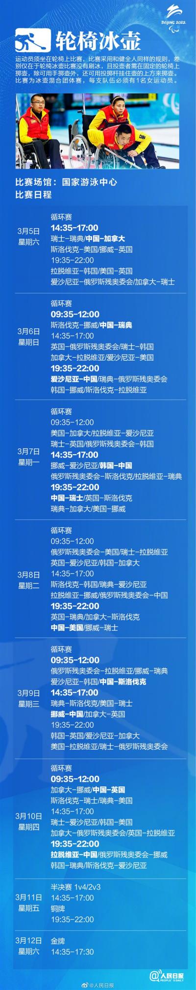 6个大项的比赛场馆、比赛时间分别是国家游泳中心/3月5-12日、国家体育馆/3月5-12日、国家高山滑雪中心/3月5-13日、云顶滑雪公园/3月6-12日、国家冬季两项中心/3月6-13日、国家冬季两项中心/3月5-11日.