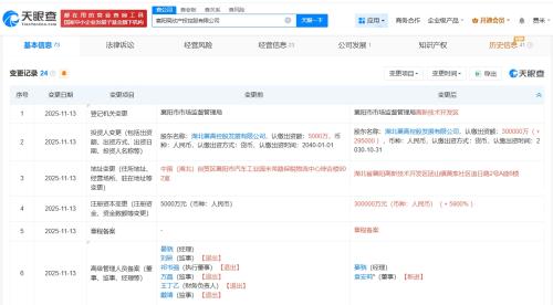 天眼查工商信息显示,近日,襄阳高欣产投控股有限公司发生工商变更,注册资本由5000万人民币增至30亿人民币,增幅5900%,同时多位主要人员发生变更。