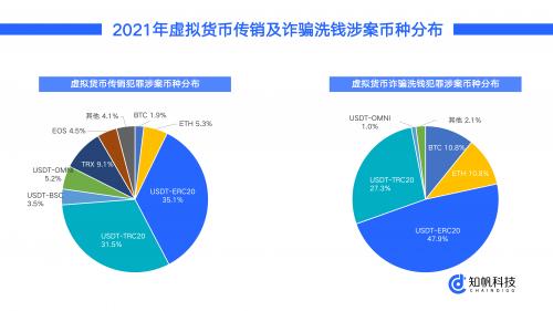 传销犯罪分子偏爱波场,诈骗洗钱更爱以太坊。在2021年的虚拟货币传销案件中,波场链上的TRX和USDT-TRC20案件数量占比明显增多,分别为9.1%和31.5%。而在虚拟货币诈骗洗钱案件中,USDT-ERC20的案件数量占比接近半数,达到47.9%。