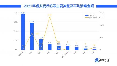 报告称,虚拟货币诈骗洗钱类案件数量最多,虚拟货币网赌类案件平均涉案金额最高。2021年,诈骗洗钱类案件数量位居首位,占总数量的38.8%,平均涉案金额较低,为0.09亿元。网赌类案件数量排在第四位,占总数量的6.3%,平均涉案金额最高,达到21.49亿元。