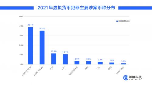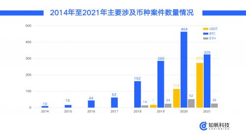 2021年,虚拟货币犯罪案件数量逐年上升。与比特币和以太坊相关的案件数量有减少的趋势,而与USDT相关的案件数量继续快速增长。