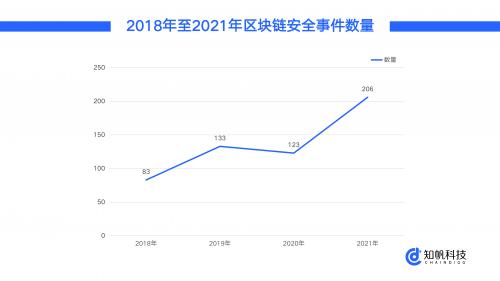 整体来看,区块链安全事件数量整体呈上升趋势。在过去几年中,区块链安全事件数量整体呈上升趋势。2021年,DeFi应用的发展加之NFT、元宇宙等新概念的出现,使得区块链安全事件的数量猛增,相较于2020年增长67%。