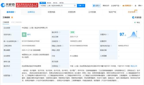 天眼查工商信息显示,11月21日,中远海运(上海)航运科技有限公司成立,法定代表人为陈弓,注册资本10亿人民币,经营范围包括软件开发、工业互联网数据服务、生物质燃料加工等。股东信息显示,该公司由中国远洋海运集团有限公司全资持股。