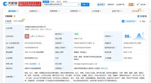 天眼查工商信息显示,近日,中国航发成都发动机有限公司发生工商变更,四川省投资集团有限责任公司退出股东行列,新增成都重产空天动力科技有限公司、四川能源发展集团有限责任公司、国家军民融合产业投资基金二期有限责任公司为股东,注册资本由约10.4亿人民币增至约14.8亿人民币,增幅约42.5%,同时,多位高管发生变更。