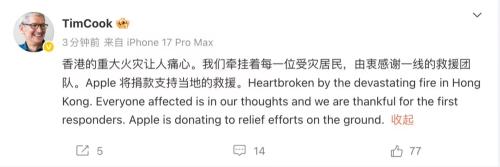 今天下午,苹果公司CEO库克在微博用中英文发文称,香港的重大火灾令人痛心。库克表达了对受灾居民的牵挂和对一线救援团队的感谢,并宣布苹果将捐款支持当地救援。