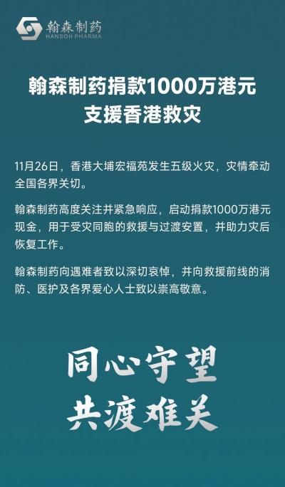 翰森制药捐款1000万港元支援香港救灾。